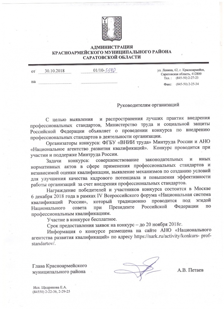 Заявки на участие в смотре-конкурсе, информационные карты и дополнительную информацию, отражающую работу в организациях по условиям и охране труда, в соответствии с Положением о проведении смотра-конкурса по охране труда Саратовской области, утвержденным Постановлением Правительства области от 19 октября 2010 года № 493-П в редакции от 22 сентября 2014 года № 534-П, прошу направить в администрацию Красноармейского муниципального района в срок до 3 ноября на бумажном носителе, а также по факсу 2-29-25.