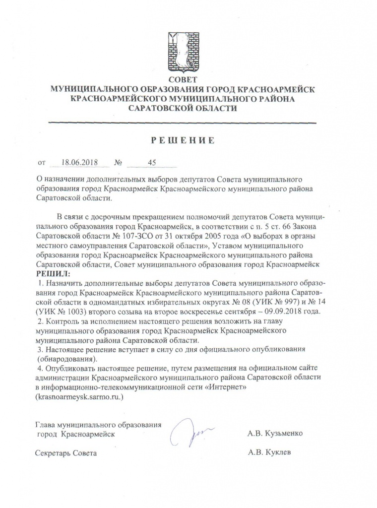 Решение от 18.06.2018 № 45 О назначении дополнительных выборов депутатов Совета муниципального образования город Красноармейск Красноармейского муниципального района Саратовской области